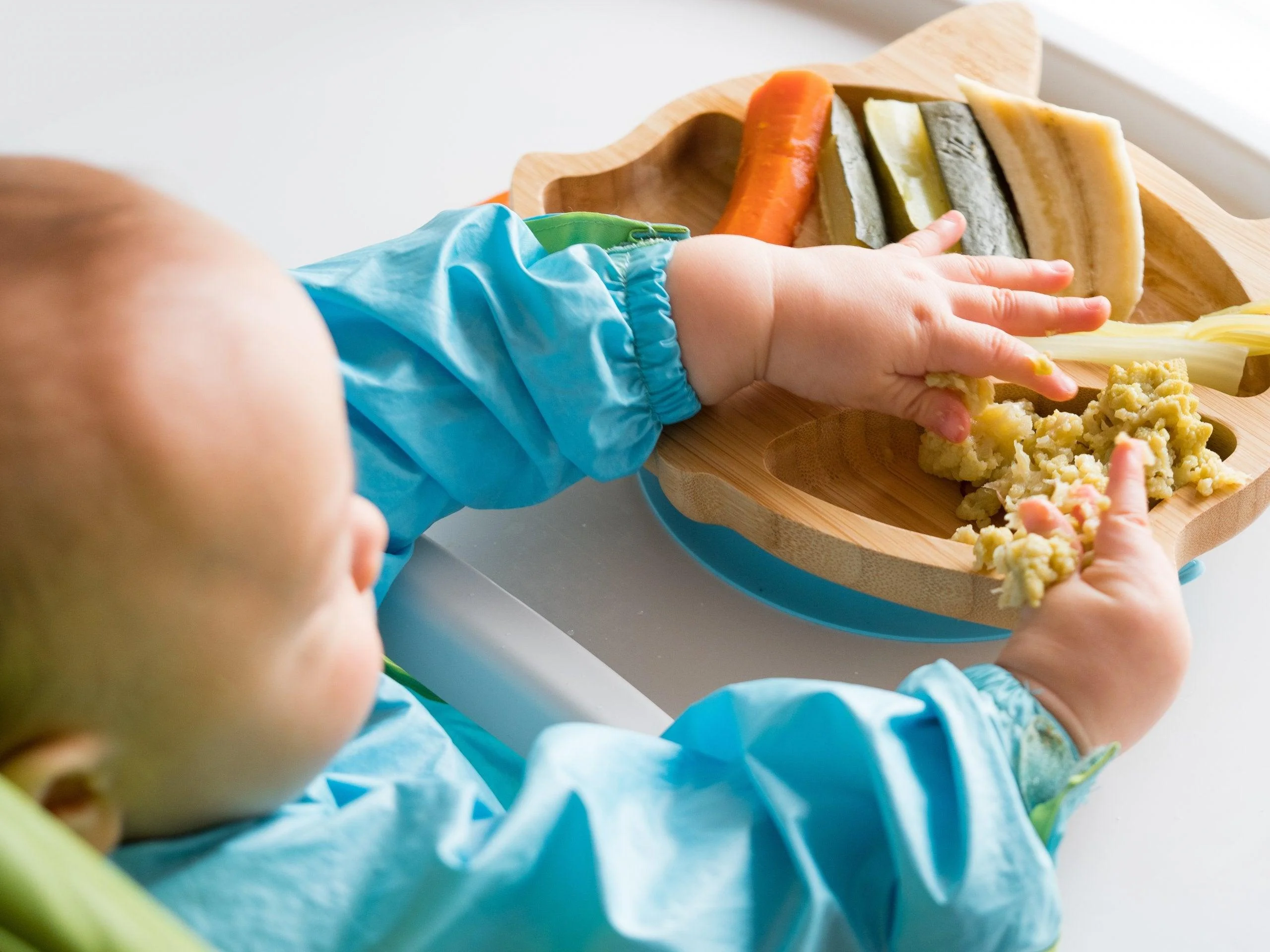 Baby-led weaning (BLW) is a self-feeding approach to introducing solids to your baby. Instead of spoon-feeding purees, you offer appropriately sized finger foods directly on the tray or table, allowing your baby to explore and feed themselves. With BLW, your bub takes the lead, choosing what to eat and setting their own pace. It's called "baby-led" because your baby has the freedom to pick up food and eat independently.
