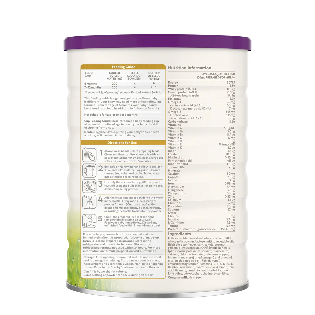 a2 Gentle Gold® Premium follow-on formula is suitable from 6 months of age and is formulated to complement the introduction of first foods. It is not suitable for use in infants under the age of 6 months.