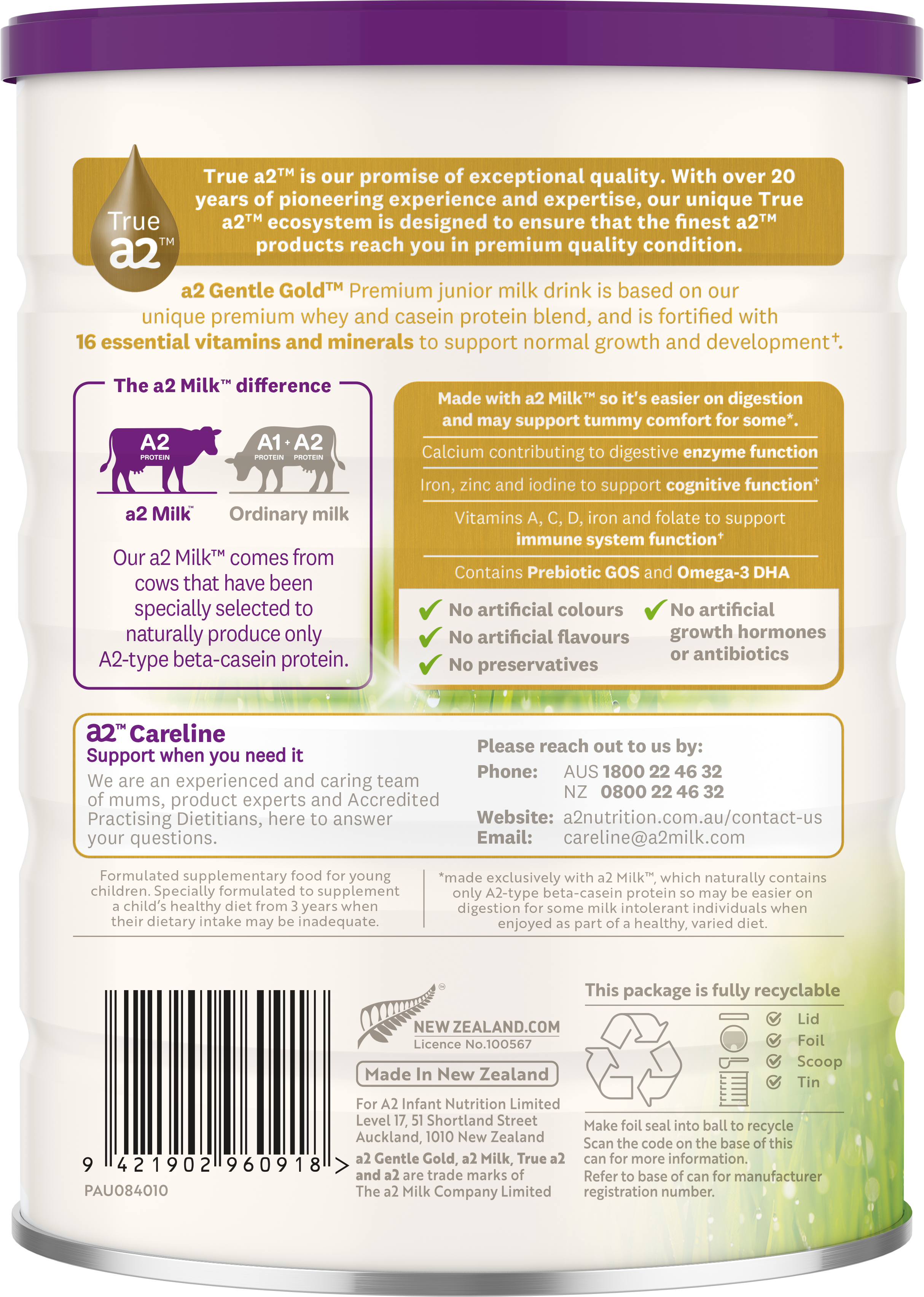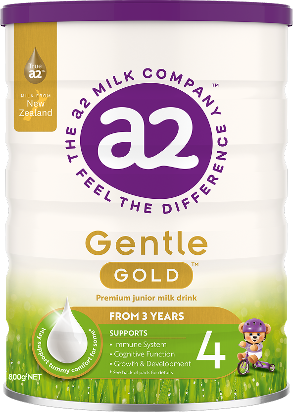 a2 Gentle Gold® Premium junior milk drink (Stage 4) is a formulated supplementary food for young children, designed to supplement the normal, varied diet of a child from 3 years of age when their dietary intake may be inadequate. It should not be used to replace food or regular meals but may replace regular cow's milk. Always follow the feeding guide on the can label.