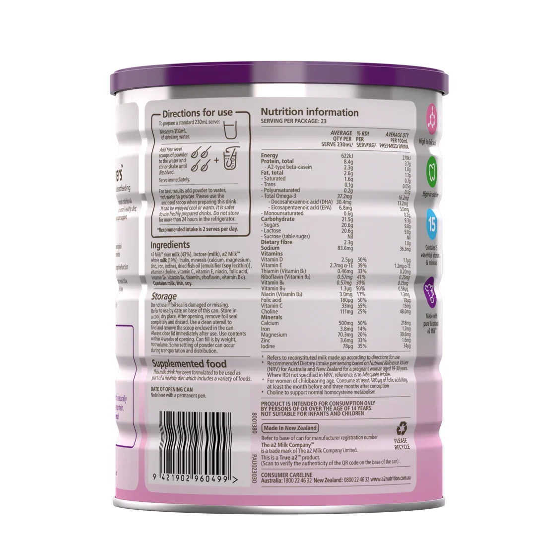 Fortified with additional nutrients, a2 Nutrition for mothers™ contains 15 essential vitamins and minerals to support women’s increased nutritional needs through pre-conception, pregnancy and breastfeeding. It is designed to be used in conjunction with a healthy diet, which includes a variety of foods.