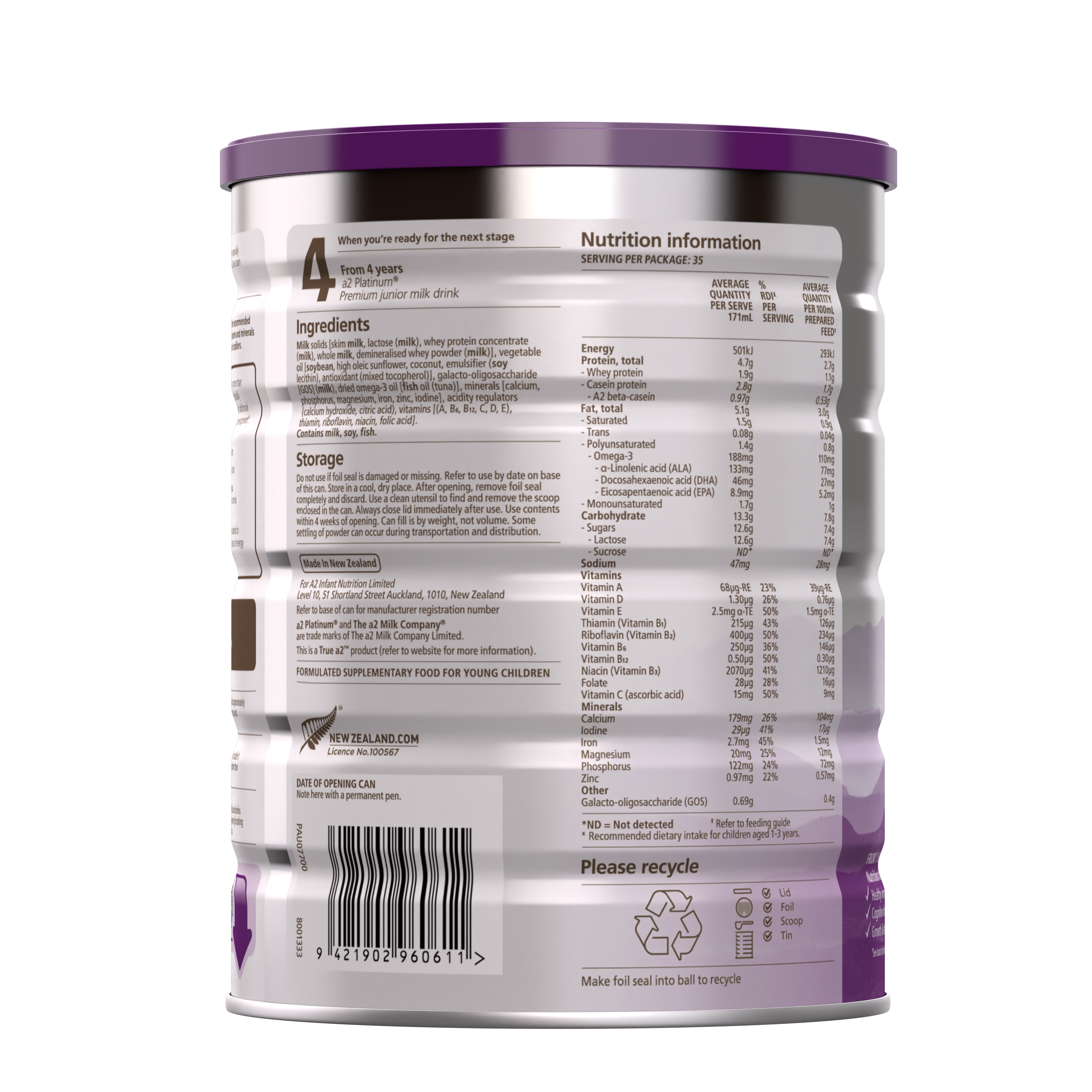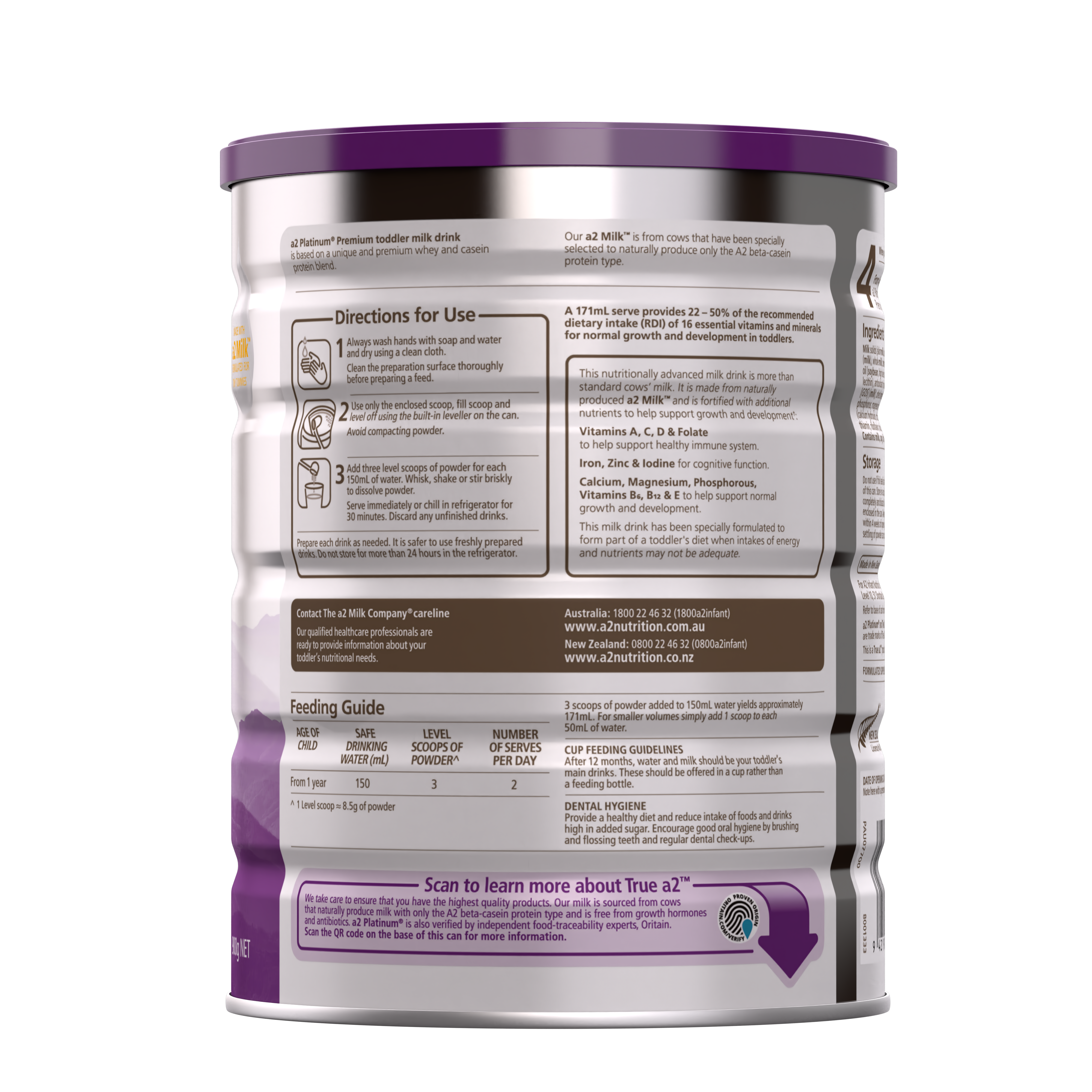 Scientifically formulated to support growth and development, and enriched to complement a healthy diet from one year old. The milk used in a2 Platinum® Premium toddler milk drink is our a2 Milk® from cows that have been specially selected to naturally produce milk with only A2-type beta-casein protein.
